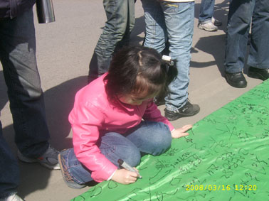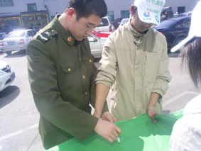 3月16日,為倡議有車族參與本活動,加強對廢油液排放的監(jiān)督,來自奧吉娜、東北大學、沈陽大學、中國醫(yī)大的環(huán)保志愿者組成了近千人的宣傳隊,在桃仙機場、北方圖書城、卓展商場、每家瑪、家樂福金牛店、麥德龍展開了宣傳。上午10時,活動現(xiàn)場設(shè)置了“支持回收車用廢棄油液-利國利民利已利后世”條幅和巨幅“迎奧運天藍水清地綠-車用廢棄油液回收活動之沈城十萬駕車者聯(lián)合簽名”錦旗,志愿者現(xiàn)場講解車用油液對環(huán)保的危害,倡議有車人士對隨意排放現(xiàn)象進行監(jiān)督。活動得到有車族的積極響應(yīng)與大力支持,不到半天,已有近萬名應(yīng)倡者在錦旗上簽名,從中可以看出沈陽市民迎接奧運的熱情和對和諧社會的向往,體現(xiàn)了沈陽市民普遍具有較強的環(huán)保意識和責任感。