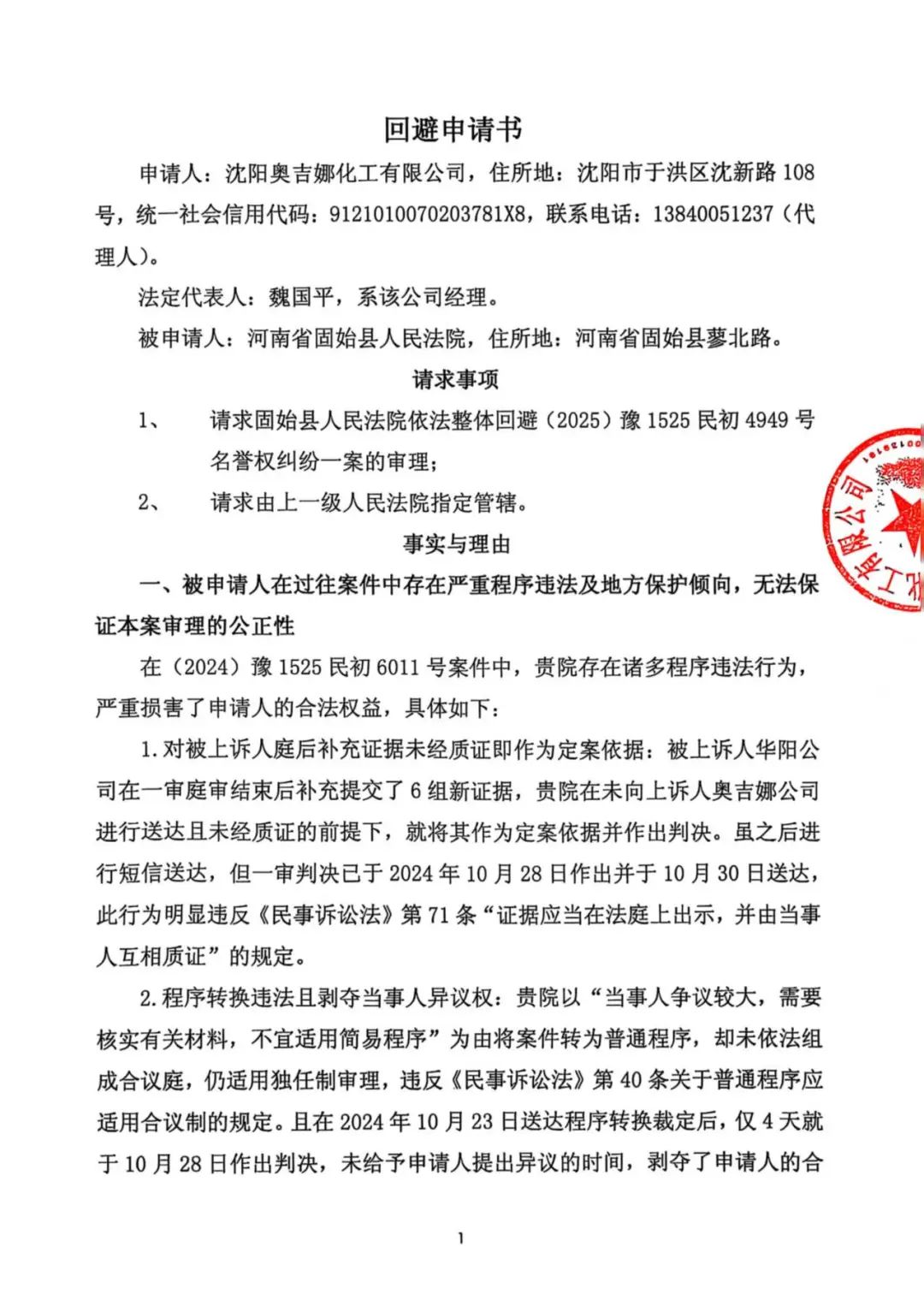 11、2025年6月13日,奧吉娜公司收到固始縣法院2025年7月4日開庭傳票。2025年6月16日,奧吉娜公司以郵寄方式向固始縣法院遞交《回避申請書》,請求固始縣法院依法整體回避(2025)豫1525民初4949號名譽權糾紛一案的審理。