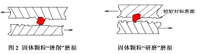 “研磨”磨損是指兩個相對運動部件的間隙中,進入與間隙尺寸相近的硬質顆粒。部件運動時,硬質顆粒與運動部件表面相接觸,像研磨劑一樣對所接觸的配合表面起著磨削作用,使配合面損傷。這種磨損是油液系統中主要的磨損形式。見圖2所示。